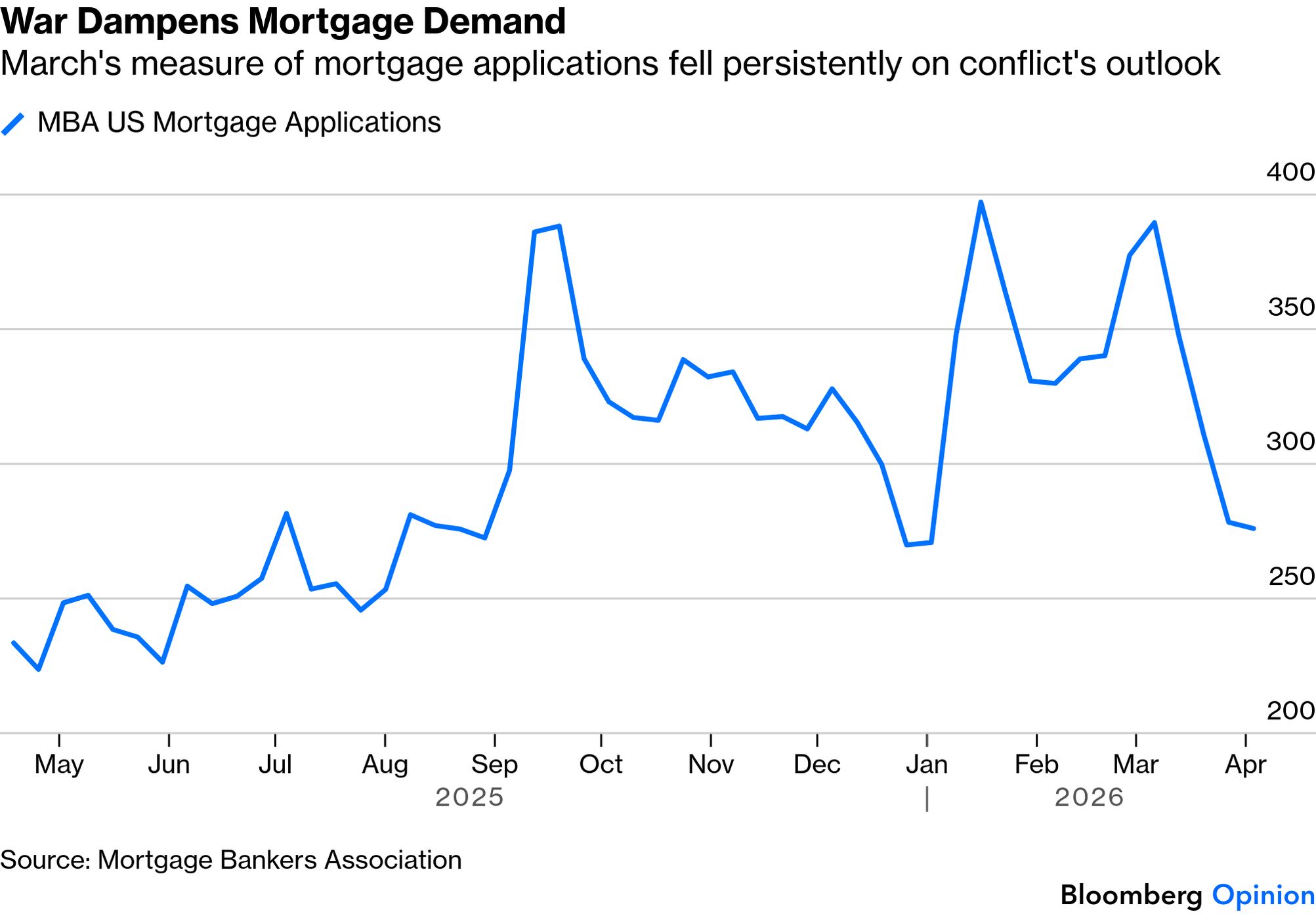 The fragile ceasefire helped last week’s slight decline in rates. But to unlock pent-up demand, they would have to trend downward sustainably, and it’s hard to see that happening while the fog of uncertainty remains. It’s not surprising that prospective homeowners are staying on the sidelines. A measure of mortgage applications throughout March fell by more than 10%. Treasury yields edged down slightly with the ceasefire, but Capital Economics’ Thomas Ryan sees little chance for a lasting relief :